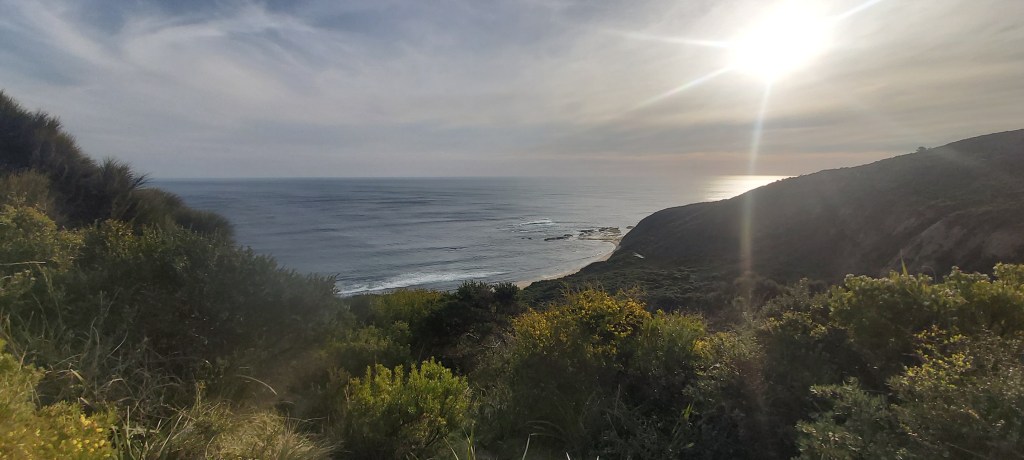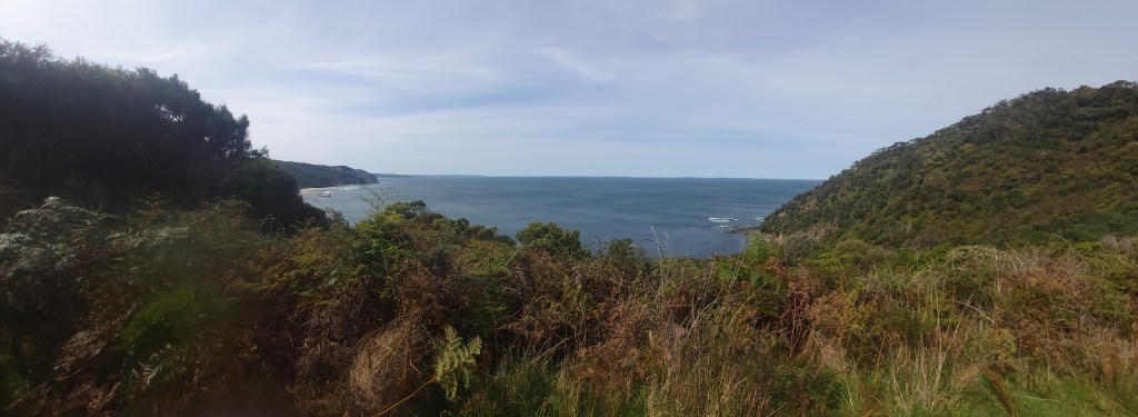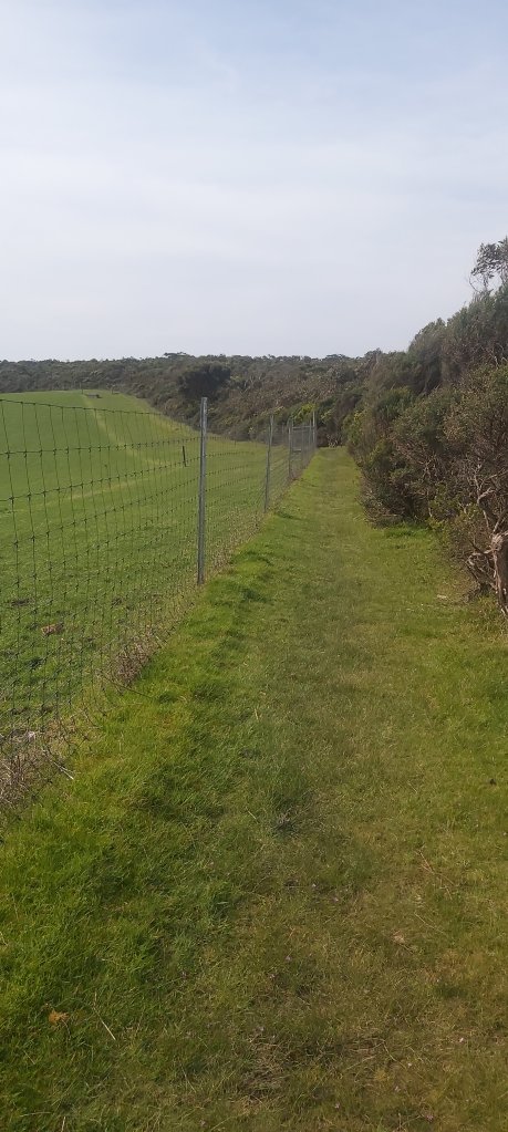 At long last, I finally managed to drag myself out of bed and pack up at a reasonably early time of 8am. Trying to drag myself away from Johanna Beach was the hard bit. I dare not think about what it’d be like to be here in bad weather, but on a day like this, it had to be the best campsite I’ve ever stayed at. But leave it I did, climbing on farm tracks overlooking rolling green hills.