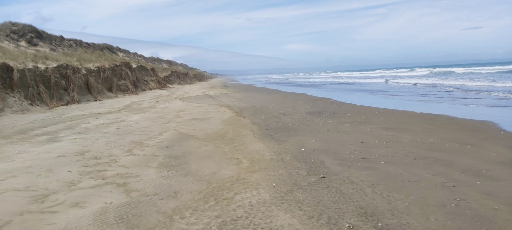 With only 17 km to walk, today’s stints were nice and easy and free from much of the pain that I arrived at Hukatere with yesterday. As such I managed 11 km before stopping for lunch, which was mildly difficult as it was high tide, leaving a thin strip of beach to sit on.