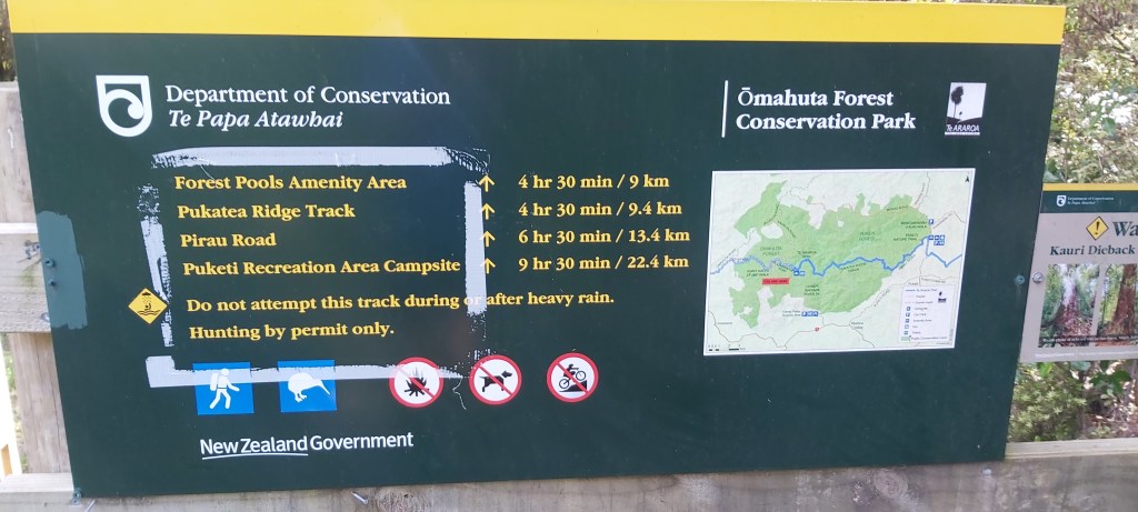 Today’s walk would be through the Omahuta and Puketi forests. Depending on who you ask, they’re just as tough as the Raetea Forest or they’re a walk in the park. As much as I hoped it’d be the former, this sign at the entrance suggested it would be a slow, challenging walk.