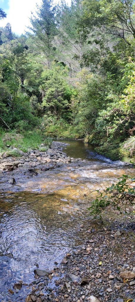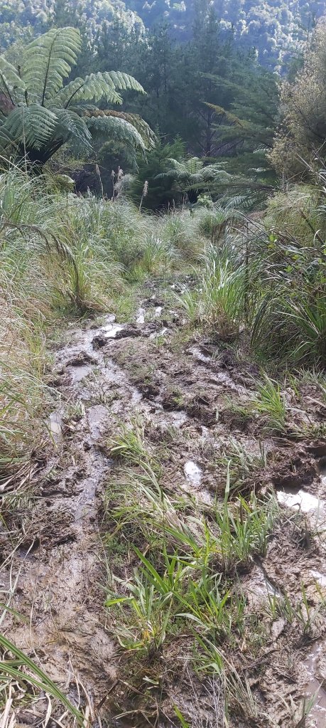 We has been walking for about 3.5 hours by this point and had only covered 4.5 km. And we still had over 15 km to go. At this point I was getting pretty concerned that we wouldn’t make it to camp before sunset, something that I always try to avoid when hiking. I like reaching camp with enough daylight left to actually relax instead of frantically putting up my tent and eating dinner before going to bed. These concerns were exacerbated once we continued walking after lunch and saw the state of the track ahead of us. I’m afraid I didn’t take many photos of this bit, it just wasn’t safe enough to get my phone out. Presumably still carrying the scars from Cyclone Gabrielle, the track was narrow, slippery, and steep. More than once we had to descend parts of it backwards like a ladder. Occasionally it was downright treacherous. In one instance, Marlon slipped and had to cling to a tree for dear life after stepping over a gully.