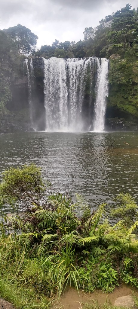 The only real difficulty with this track was a bit of mud in places which was easily avoided; quite a nice change after yesterday’s, er, “adventure”. Once out of the farm, the track meanders along the banks of the Kerikeri River until it reaches SH10, where Vadem and Marlon were hoping to hitch a ride into Kerikeri. It soon became apparent that that would not be possible, with far too much traffic and far too little shoulder to stop a car on. So, I guess they’d just have to walk wth me into town. On the plus side, it was a very nice track, clearly very popular with local residents, passing through grassy fields and shady forests on a well-formed path, eventually reaching Rainbow Falls.