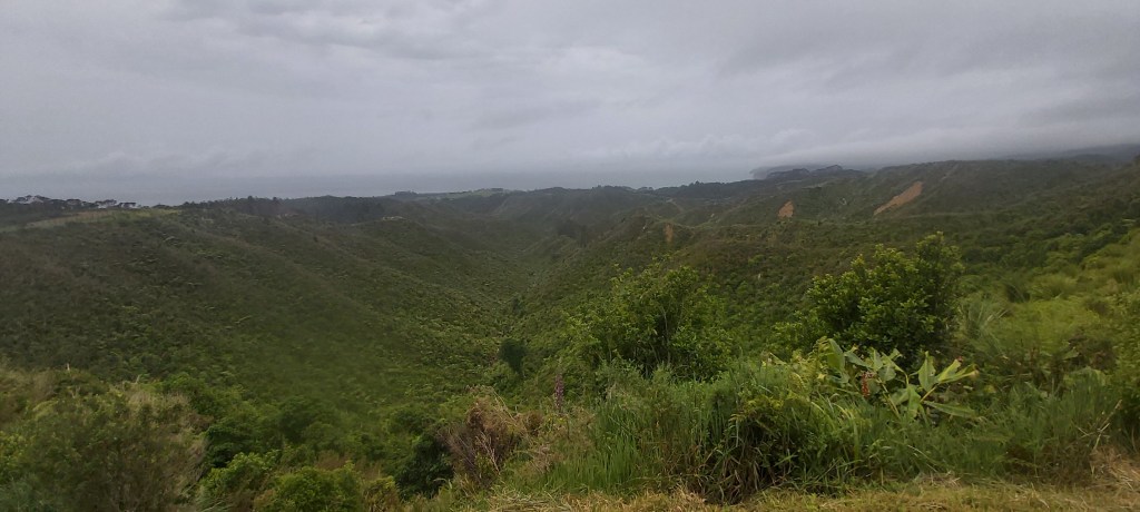 We were soon descending off the ridge on a gravel driveway, providing more grip than mud (I know, that’s a pretty low bar to set) but still demanding a slow pace; no need to take any unwarranted risks this early on. I reached the main road in an out of Mangawhai around 1pm, checked to see how far I had to go… 15 km. I was only halfway. That was quite demoralising. The combination of rain, pain, and just general fatigue was getting to me in a big way. The temptation was there to try and hitch a ride on this road all the way into town. But I resolved to stick to the track as it’s shown on the map, both for reasons of integrity and the promise of a coastal clifftop walkway.
