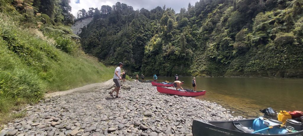 On both sides of the river were tall, steep cliffs, which got me wondering where and how we would park our boats at the campground. At 6:30pm, I found out. A giant DOC sign on the cliff pointed to the campsite, at the bottom of which was a thin “beach” already full of canoes, trees, and rocks. A path led up to the campsite itself, but not before a small rock scramble to reach it. Nil and I pulled in, making an absolute hash of tossing the mooring rope to a wooden pillar on the cliff above us. Carefully and very slowly, we lugged our barrels up the rocks and path to the campground. Most of the flat land was already taken by other people’s tents so I had to settle for one with a bit of a slope to it.