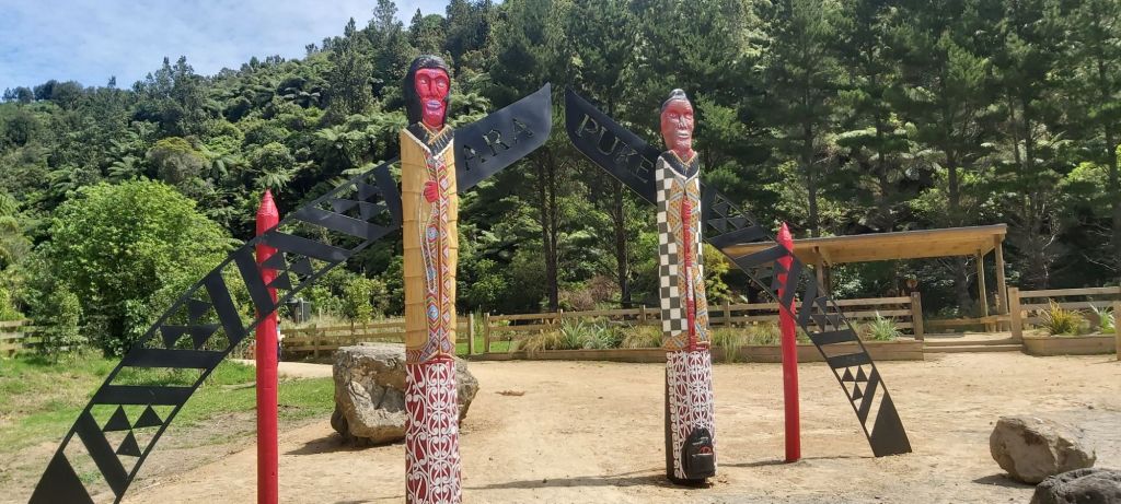 But as the sign alluded to, we’re not done yet. There was still a little way to go before reaching tonight’s camp, a shelter set up in 2019 for Te Araroa walkers by – you guessed it – the Palmy council. Descending down a pine plantation, we arrived at this shelter, I believed designed in the form of a Maori marae.