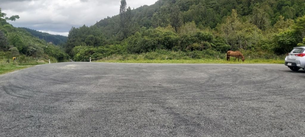 This was probably the hardest bit of the trail. Now on an old forestry road, the descent were down steep rocky paths that didn’t have the same tree roots steps that we’d grown accustomed to. Grip was hard to come by, although annoyingly this didn’t effect Melly or Snacks in the slightest. Nevertheless, I got down in one piece, making a final river crossing and popping out into a carpark supervised by a horse.