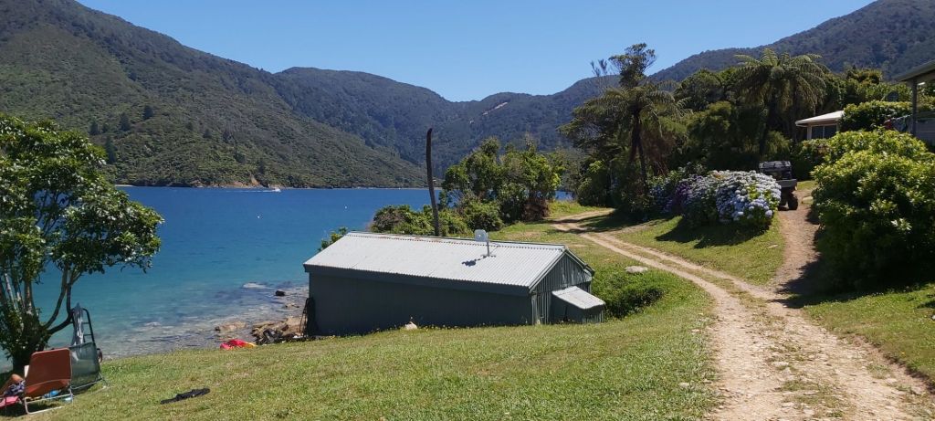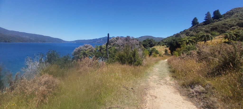 From Tawa Saddle we got views over all of Endeavour Inlet and much of Queen Charlotte Sound, both of which appearing a gorgeous deep blue. A few day hikers were also out on trail, easily identified by the lack of any massive packs on their backs and fresh looking faces. One thing that was beginning to worry me slightly was the time and how much distance we had covered. Despite the low elevations and easy track, we still had to climb a combined 1200 m. I tried my best to put all that aside as we descended towards the inlet where it became oddly busy. The trail seemed to bisect a small village, a row of holiday homes on our right all with their own private tracks down to the beach on our left.
