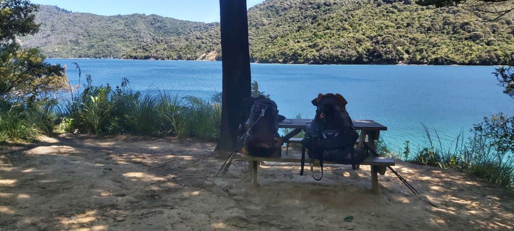 A cool morning welcomed us into the new day. Turns out a big hot ball of gas millions of kilometres away can be stopped by a simple mountain. The one thing with cool mornings is everyone moves slower. We didn’t get away until 9am, our first stint lasting all of about 15 minutes, popping down to Resolution Bay for a coffee and snacks. Apart from the DOC campsites, there are several private lodges along the track offering more upmarket accommodation for those with the budget for it. Resolution Bay is one such place and I can see why it would be a popular spot to spend a night.
