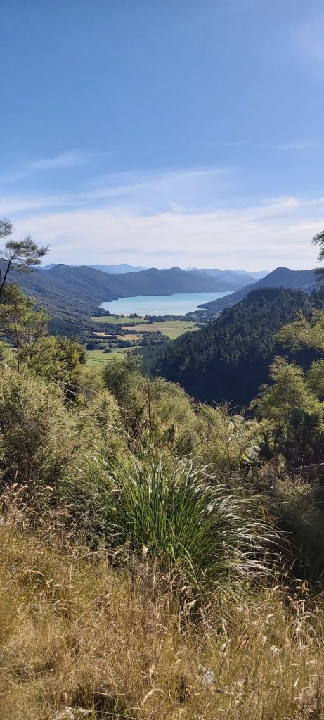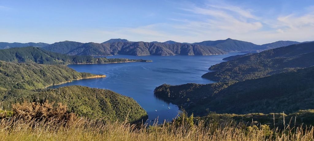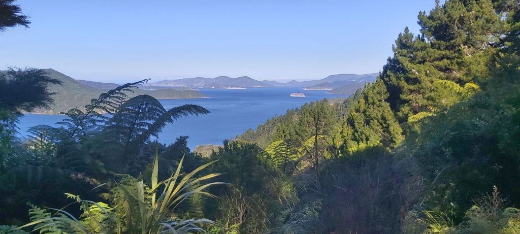 Following the ridge, I spent most of the time in the cover of trees with the occasional gap to let in glimpse of either sound as a sort of reminder as to why I’m out here doing Te Araroa: spectacular views alongside awesome people. I was lacking the latter, so at a picnic bench I stopped for a snack break and let the others catch up. I have to say, I’m loving the lightness of these trail runners, they’re definitely helping to contribute to helping me get up mountains quickly. Out in the sounds were countless small white wakes of boats going to and fro, along with a nice big wake from a cruise ship heading back out into the ocean. One has to wander how long it took to turn that bad boy around at Picton.