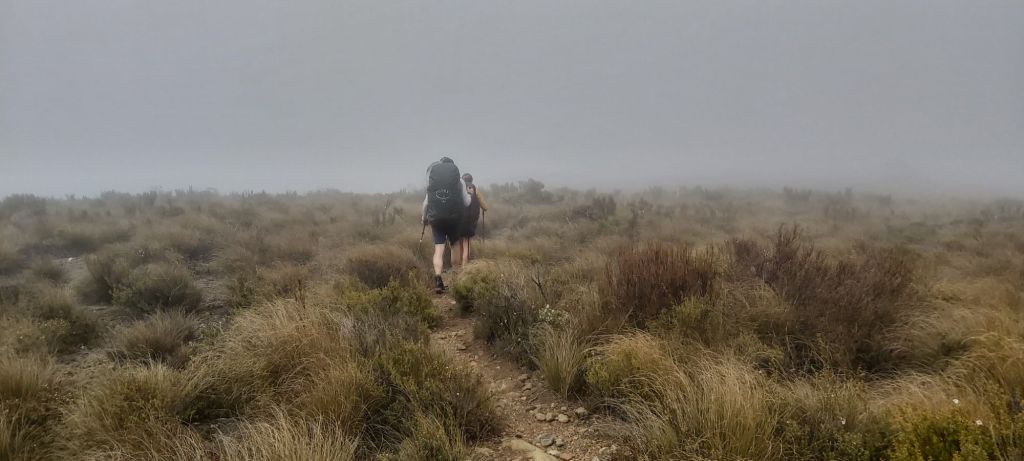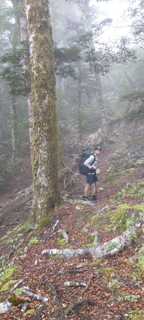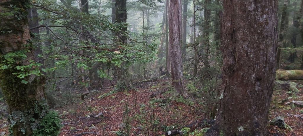 Oli decided to join our party of four, all aiming for the far target of Slaty Hut. We’d given ourselves the best chance of making it there in good time: leaving the hut early, walking on a decently good path, and keeping a steady pace. As soon as we left the rain stopped, leaving us to walk through a recently moistened forest in the clouds.