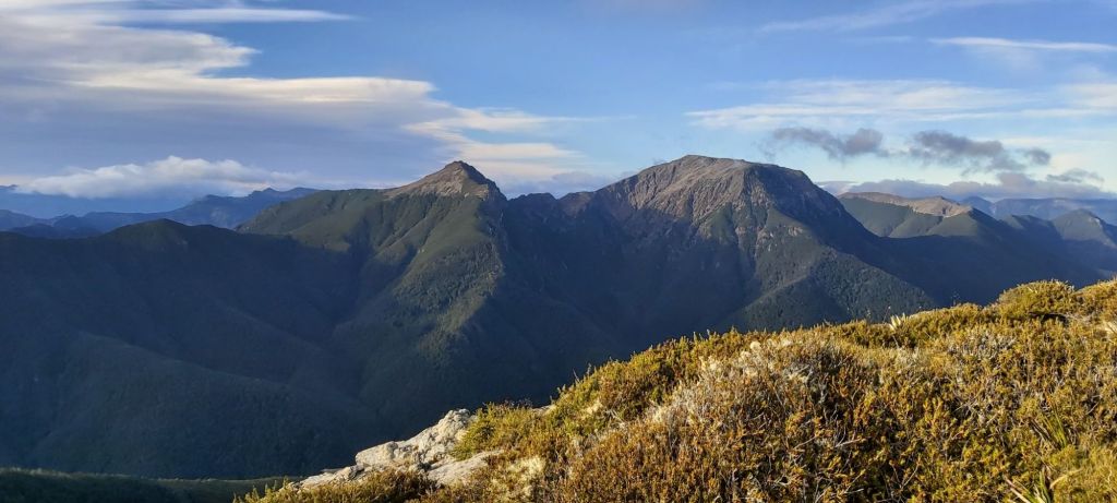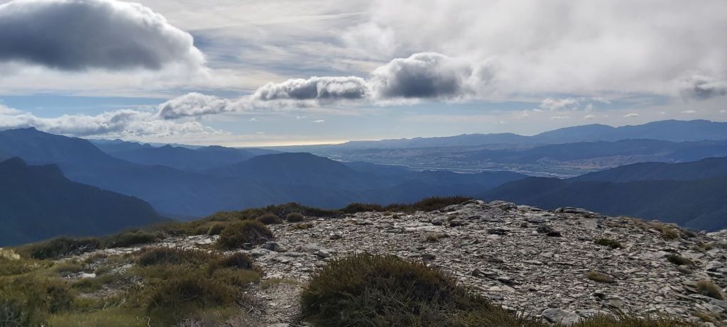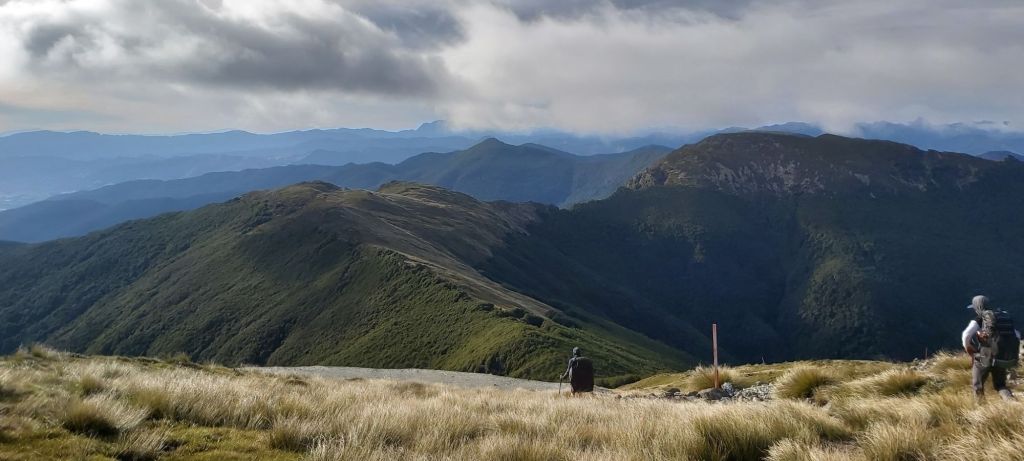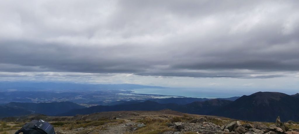 Before heading up Old Man (yes, that is the name of a mountain, I didn’t just climb up a senior citizen) the track dropped back into the forest, the trees helping to diffuse the wind and make for a more pleasant walk. For the most part the trail had been much less technical than the Tararuas. That isn’t to say it wasn’t hard or slow, it was both these things, but I was walking it with an entire island’s worth of hiking experience. Case in point, the climb to the summit of this shorter hill was hard work but it was completed well. The winds returned at the top as did the views, looking south towards yet more mountains.