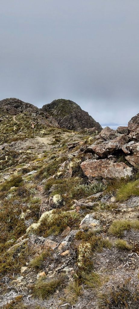 Surprisingly, those two anthills were only about 10 km away, despite the perceived distance from where we were. As we walked along the ridge I could see clouds gathering over them. The forecast also suggested rain would arrive in the early afternoon. All these things did not fill me with much confidence that it would be a safe climb up them and I considered if the smart thing to do would be to call it a day at Old Man Hut and attempt the summit tomorrow. There was still time to make that decision, I’ve still got to walk there over this very windy ridge.