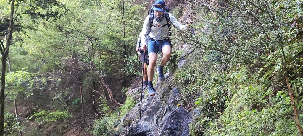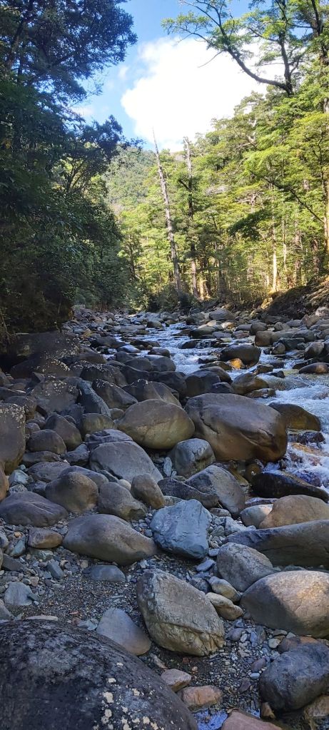 Today promised to me quite a bit more challenging than yesterday. It’s rather bold of the trail notes to assume I wasn’t sufficiently challenged by yesterday’s walk. Today would be another big climb almost to the top of Mt Ellis, although that would be happening towards the end of the walk. First things first, we’d be following the Wairoa River upstream from Mid Wairoa Hut to the creatively named Top Wairoa Hut. The track started with a bang, getting right into a cliffside sidle, including a small section requiring the use of a wire bolted into the rock.