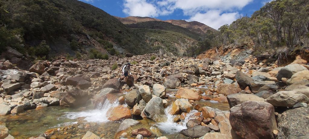 Oh, and did I mention we were still climbing? And now we didn’t have a forest to shelter us from the sun. My arms were soon coated in a thin layer of sweat as I struggled over each rock. Looking around I could see that the surrounding mountains were of a similar colour and composition. How surprising it was that I started this traverse of the Richmond’s in a very green forest following a very green river, then crossed over two very rocky mountains into another lush forest, and now I’m in Australia.