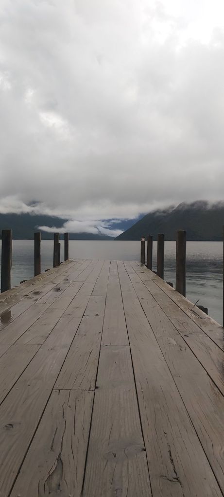 Keeping the food train rolling, we went across the road to the Alpine Lodge for lunch where I just opted for a garlic bread and a tea whilst sussing out what I’d get for dinner. Then it was time to check-in and grab our boxes. Ah, it was more food than I remembered. No matter, I’m fine with carrying the extra weight for a couple days. For the rest of the afternoon, I frantically ran around completing a bunch of little tasks that needed doing, especially laundry and having a shower. Good grief did I need a shower. When it came time for dinner, instead of opting for the traditional fare of burgers and pizza I chose a salad with lamb. Great choice. Not just because I hadn’t had vegetables since Havelock, but also because it was bloody tasty. To help it digest, we took a walk down to the shore of Lake Rotoiti.