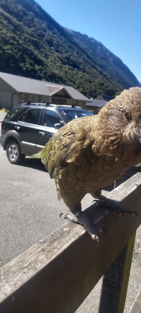 At least that’s what I thought. I assumed we wanted to get walking again by 10am, but the others were taking their merry time to get packed. First order of business was getting our resupply boxes and (sadly) making our packs heavy again. No more 7 day carries for a while now, the next few sections would only be for 3-4 days. Following that was the more important matter of breakfast at the Alpine Store next door. Partly this was for the food itself, but mainly it was for the promise of a kea party. I was not left disappointed. Despite the signs asking people to bring their dishes inside once they were done, someone hadn’t, much to the delight of the local feathered clowns. A group of them descended on the cafe to see what was up.
