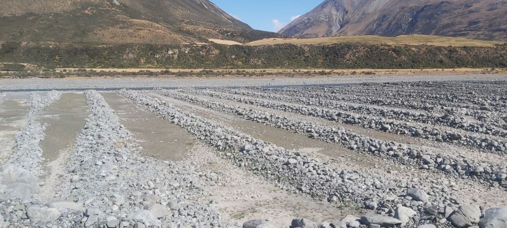 Our final major crossing was the Avoca River, still with about 10 km to go in the day. Mercifully we found a shady spot where we could rest for a bit. That was all I needed. Once I got going again I felt much more energised, looking forward to reaching tonight’s campsite. For the last little bit we had to walk on a gravel levee next to Glenthorne Station. The pretty conservation areas in the upper reaches of the Harper River had been replaced with views of cow paddocks and these odd formations built into the river.