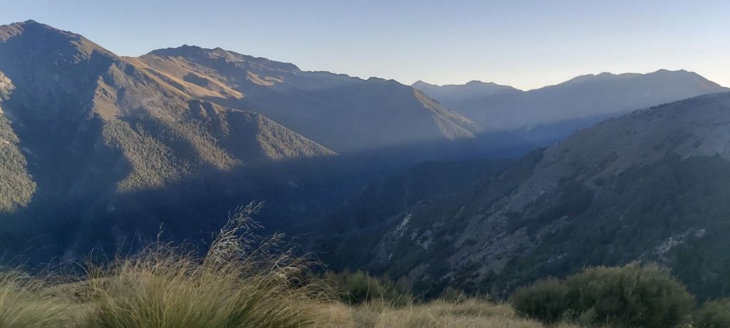 I never thought I could sleep this well in a tin shack with a dirt floor. It did help that it was a warmer night than the previous one. Even more strangely, I was awake and alert before the sun was up. I don’t think I’ve ever been like this when I’ve been with the trio. Granted I was still the last one to leave the hut, exiting the front door (the only door to be fair), and climbing up to a ridge looking over Stodys Hut.