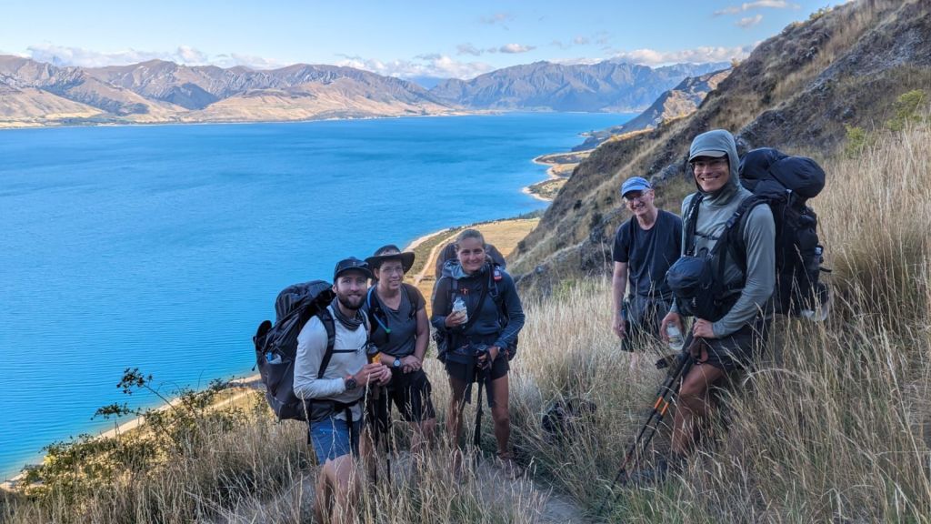 Having camped at the peak last night, Matt and Melly had started just after sunrise, aiming to reach Wanaka by this evening. A long day, but a flat day once they got down to Lake Hawea. Oli spent the night in Pakituhi Hut, so they met up and walked down together. A little later, my family began the climb up to Breast Hill from said lake, although only going as far as the top of the switchbacks. They hadn’t gone far before meeting the trio, stopping to say hi and offering them soft drinks and chocolates.