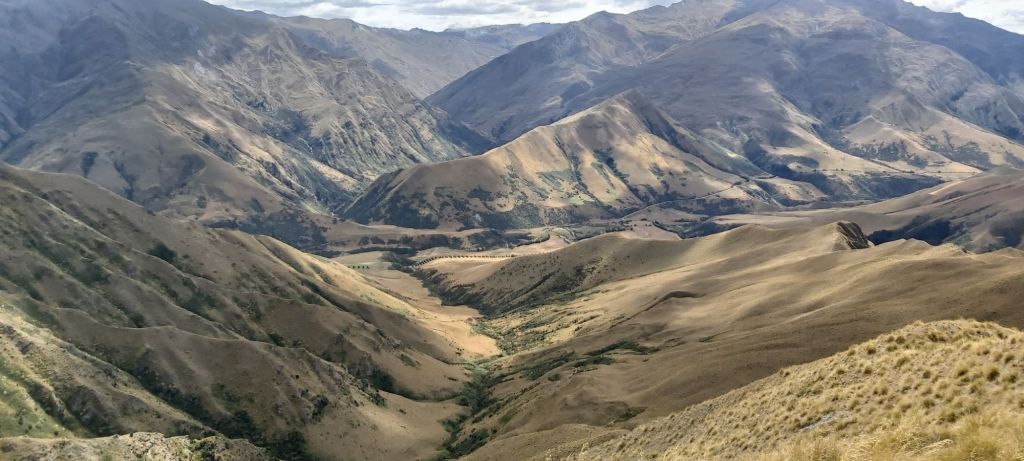 Team Deutsche (and Matt) arrived 20 minutes later, Paul now sporting a brace on his right knee. These descents demand a lot out of them and that’s coming from someone in their mid 20’s who is trail fit. I left the stream feeling good as I was right on my expected pace for this section between Highland Creek and Roses Hut. A late finish it’ll be, but not extremely slow. The climb up from the stream did not make me feel good, but I was happy with the view from the treeline. Sure it was the same old valley I’d seen for the last few hours, but now there was a crazy Swiss mountaineer in the foreground. Oli was patiently waiting for us to reach him here and would now take Maria’s pack to the hut. I carried on, now rising up some lovely switchbacks and along another fence line, stopping only to book a campsite in Arrowtown for tomorrow. This was by far the easiest climb of the day, only taking an hour to reach the top.