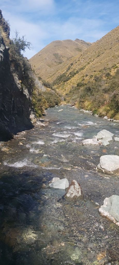It never got more than knee deep, most of the time only licking at my ankles. The river itself was super clear, the bottom covered in green rocks that sadly weren’t greenstone (not that we could’ve taken it, all pounamu is property of the local iwi where it was found). The area is known for its gold mining history and for most of the walk Oli persistently tried to sell me “gold” that he’d found in the waters. It very clearly wasn’t gold, but that wasn’t going to stop him. We’d definitely made the right call in following the river. None of the actual crossings of the river were bad or dangerous (although Paul and Maria weren’t used to doing such crossings and held hands over all of them which I found very adorable) and the river bed wasn’t slippery at all.