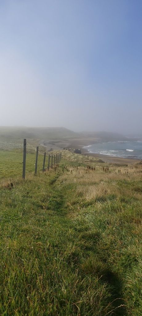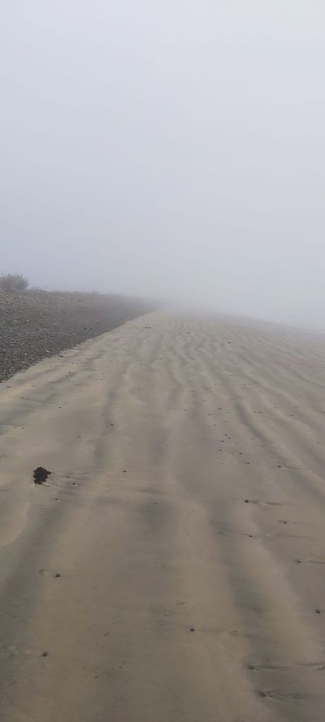 I was slow to get away this morning, which yes is par for the course for me, but I was properly taking it casual this morning. I didn’t leave the holiday park until 8:30, a pretty late time considering the distance to cover today (I will say, I didn’t actually know how far it was to my destination until I arrived there). I figured I’d be able to cruise over the sand pretty easily so no worries from me. Perhaps I should’ve been a bit more punctual, because the tide was up at the first beach, forcing me onto the loose gravel slopes above it. Loose gravel… is slow and annoying and could’ve made this walk quite miserable. That was averted by a thick fog bank that lathered the coast in cloud, dropping visibility to around 20 metres.