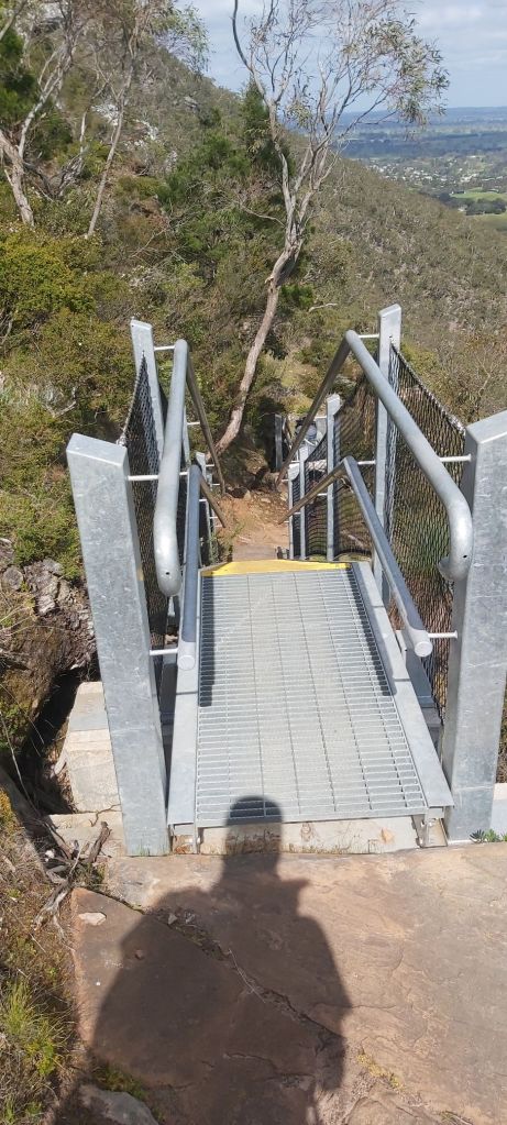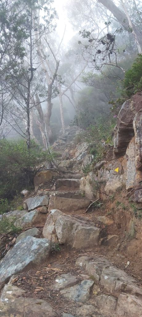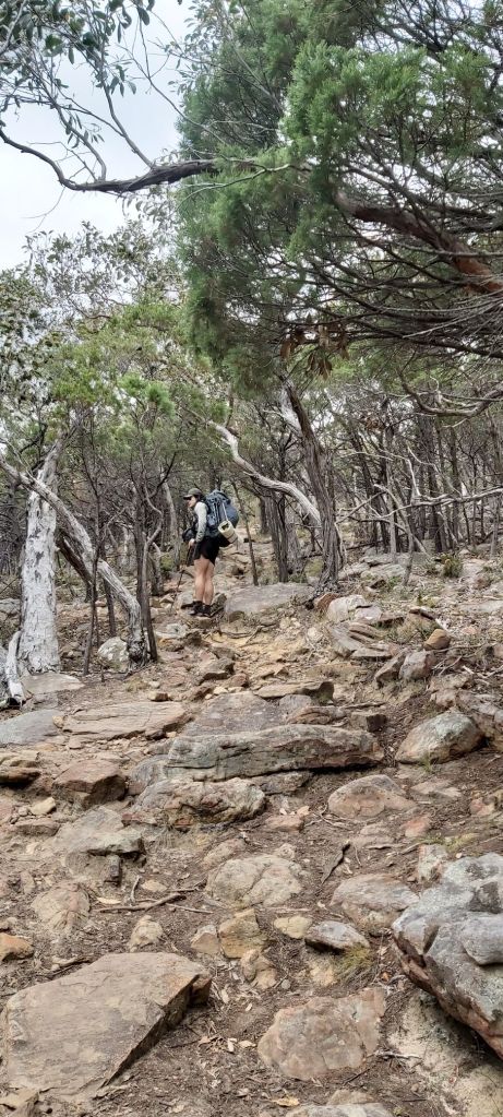 With Matt having a fairly lengthy drive ahead of him to get back to Melbourne, we didn’t want to leave camp too late, setting off just before 8am. Today would involve three major climbs, the first of these being Signal Peak. As expected, the track was steep, but with a great deal of assistance from stairs. Scrambling can be great fun, provided you’re only walking short distances; on the longer days that we’ve had, I tend to get a bit impatient if we’re not going a certain speed.