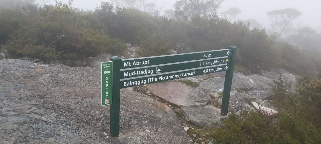 With clouds still enveloping the mountains, we reached the summit of Mt Abrupt. Reaching the tops of mountains usually elicits one of two reactions: “wow, what a cool view, let’s stay up here for a bit and admire it”, or “it’s cold/windy/raining and there’s nothing to see, let’s get down as soon as we can.” This was more of the latter.