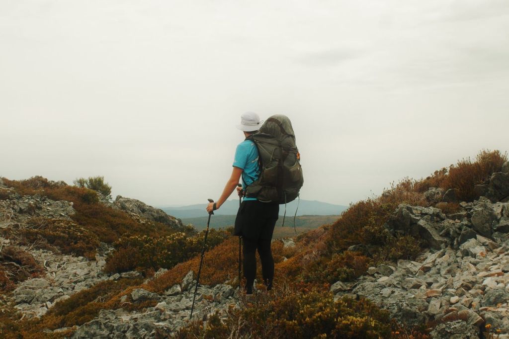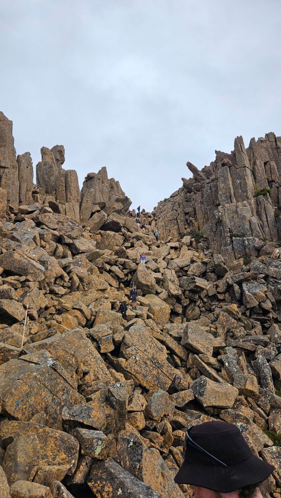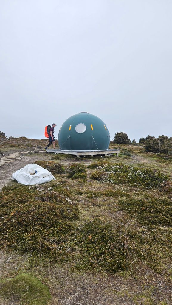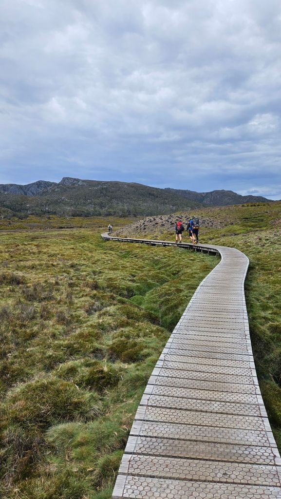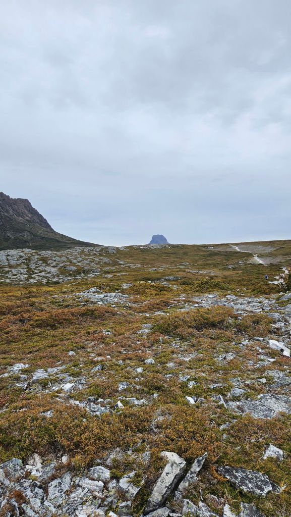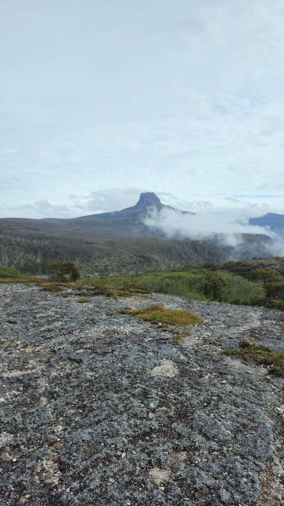 Going down was easily harder than the climb, but carefully we got through the boulder problems and returned to Kitchen Hut… just as another shower came through. Makes sense, these are the Tassie Highlands after all. Once it cleared we started the final 5km push to Waterfall Valley Hut, watching Barn Bluff getting slowly bigger on the horizon.