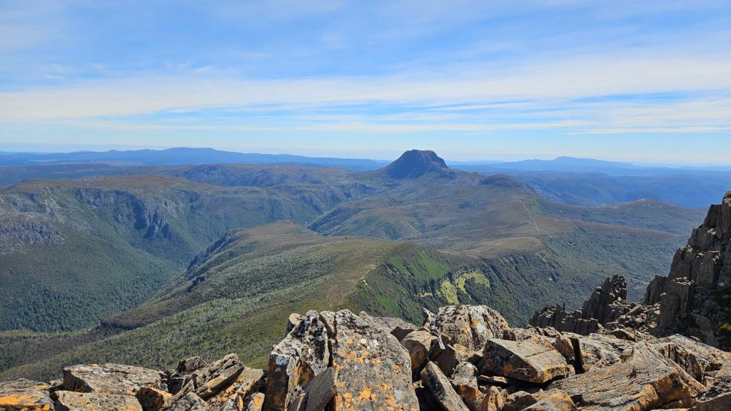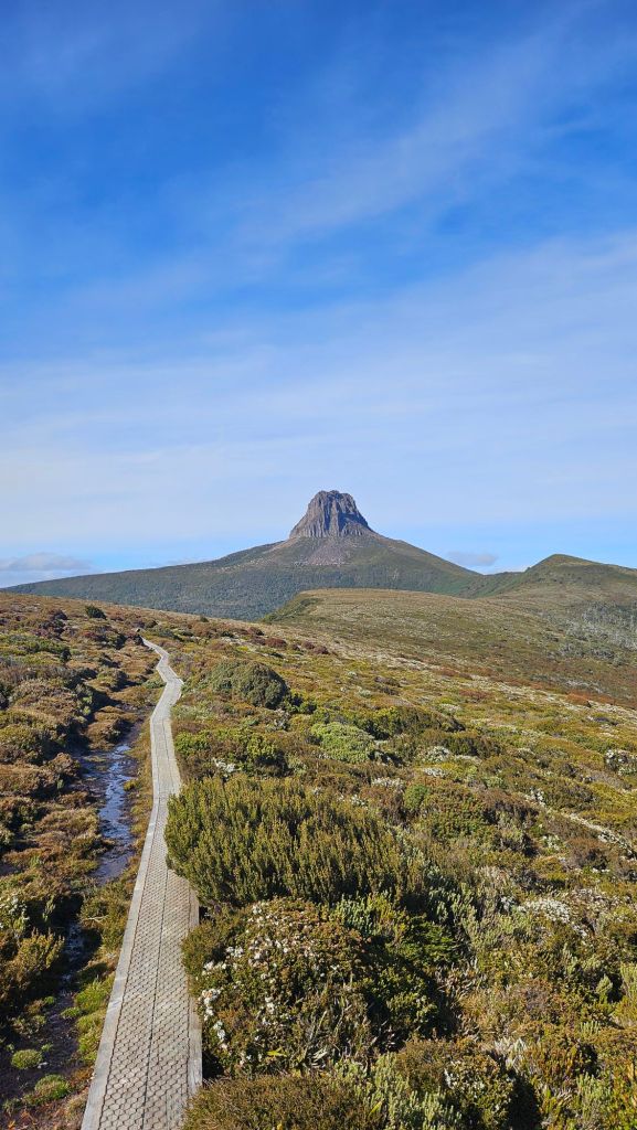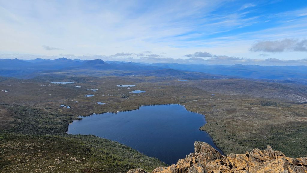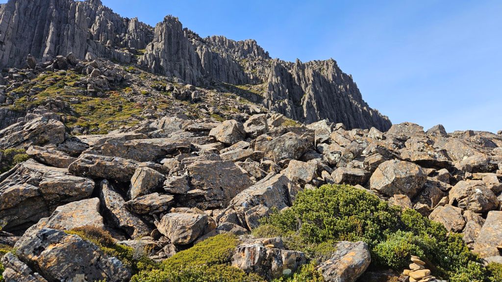 Most of the way there was on the plateau we walked on yesterday, easy walking on wooden duckboard used to protect the fragile alpine environment up here. That said, it didn’t take long for the track to turn almost into a repeat of the Cradle Mountain climb we did yesterday. The duckboard gave way to rocky steps which in turn gave way into a boulder field to scramble through.