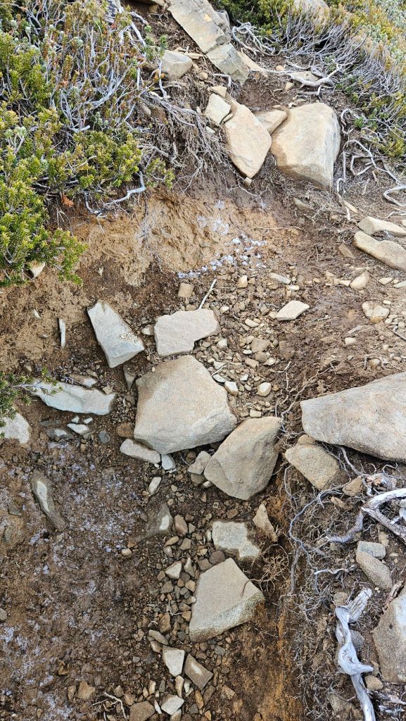 Unlike Cradle however, there were no neatly placed marker poles to help guide us up the peak. Instead we had to rely on sporadically placed rock cairns and the occasional orange trail marker. The markers only pointed up so we wouldn’t be able to rely on them coming back down, but that would be an issue for future Jono and Hammy. Another issue was the constantly fluctuating winds coming through, forcing us to stop regularly to either put on or take off our rainjackets. Once we got high enough we just left them on.