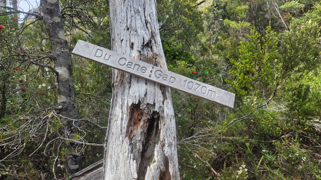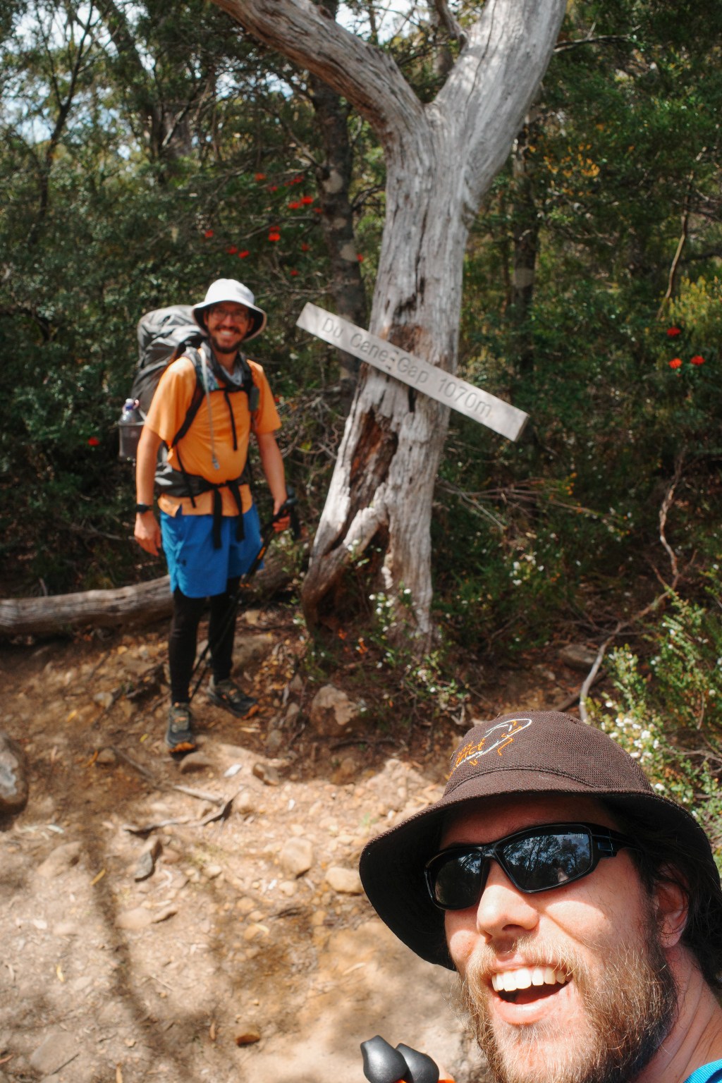 The climb was less than 200m of elevation gain, but the way we were feeling plus the surprisingly hot temperatures meant it was hard going. We took breaks, stayed hydrated and did our best to distract ourselves from our ailments until the climb was completed, marked by a simple wooden sign nailed to a tree.